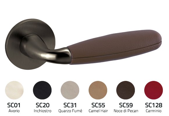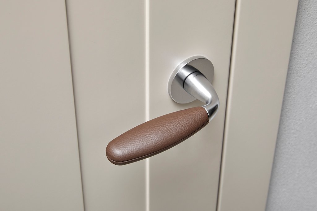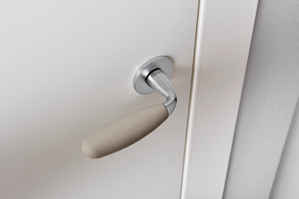 Ergonominė bei išskirtinė Olivari durų rankena skirta vidaus patalpų 38-45 mm storio durims. Rankenos tinka Europinio (DIN) standarto spynoms. Rankena yra su minimalistinėmis 5mm storio rozetėmis.