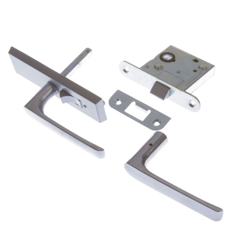 Įleidžiamas vidaus durų spragtukas vonios kambariui ar tualetui (WC), su rankena, užraktu ir staktos plokštele.