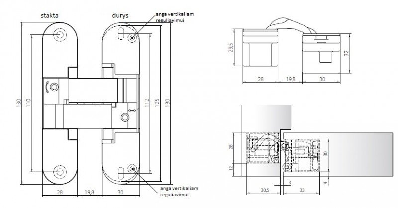 Paslėpiami (uždarius duris nematomi) lankstai AN 141 3D FVZ 12/38 skirti vidinėms neužlaidinėms (be bortelio) durims, kai ant staktų reikia klijuoti stiklą/plokštę/skydus/gipsą. Vyrius galima montuoti 12mm nuo staktos krašto, kas palengvina gipso/kartono arba apdailinių skydų privedimą viename lygyje su varčia. Durys gali būti varstomos 180 laipsnių kampu. Universalūs, nekryptiniai. Maksimalus vyrių apkrovimas 40kg/2vnt. Minimalus varčios storis 38mm. Vyriai turi apsaugą nuo montavimo putų. Vyriai pagaminti iš cinko lydinio ZAMAK ir ABS termoplastiko, ašys iš nerūdijančio plieno. Vyrio aukštis 130mm, plotis varčios pusėje 30mm, staktos pusėje 28mm. Vyriai reguliuojami trimis kryptimis (nepriklausomai viena nuo kitos). Reguliavimas: vertikaliai +/-2,5mm; horizontaliai +/-1,5mm; į gylį +/-1mm.
