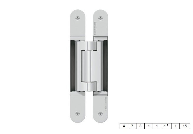 Pagaminti iš cinko lydinio ZAMA. Skirti sunkaus tipo neužlaidinėms durims su medine, metaline, aliuminine stakta. Reguliuojami trimis kryprimis. Universalūs. Turi apdailinius dangtelius. Maksimali apkrova 200kg (2 vyriai). Reguliavimas: vertikaliai +-3mm; horizontaliai +-3mm; gylis +- 1mm. Minimalus varčios storis 40mm. Apsaugoti nuo montavimo putų. Vyriai tinkami naudoti priešgaisrinėms, priešdūminėms, akustinėms ir apsauginėms durims.